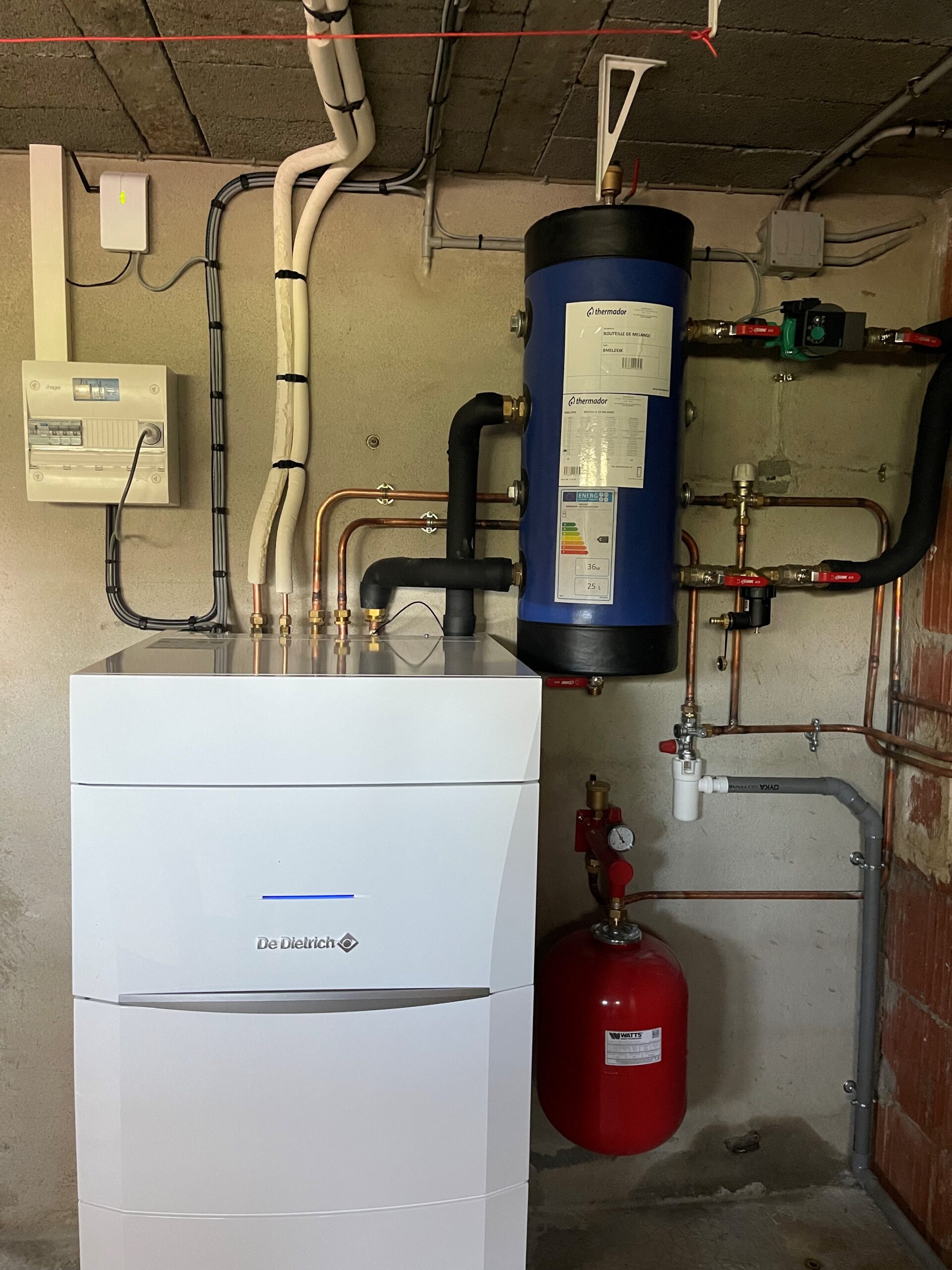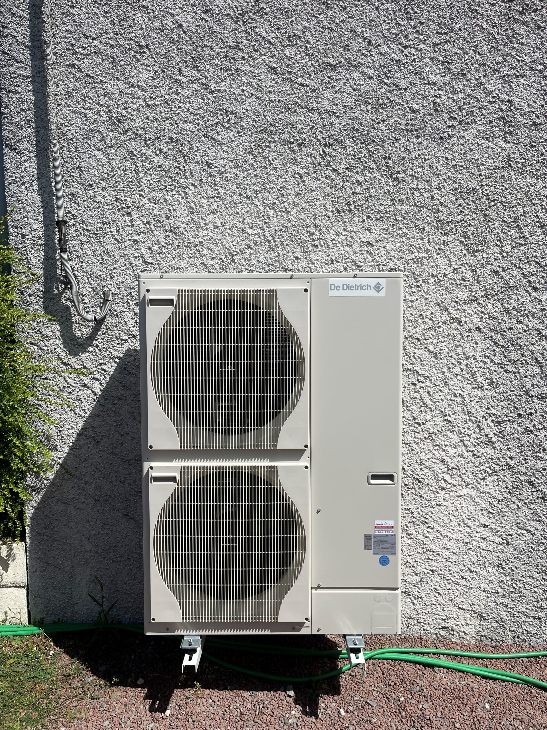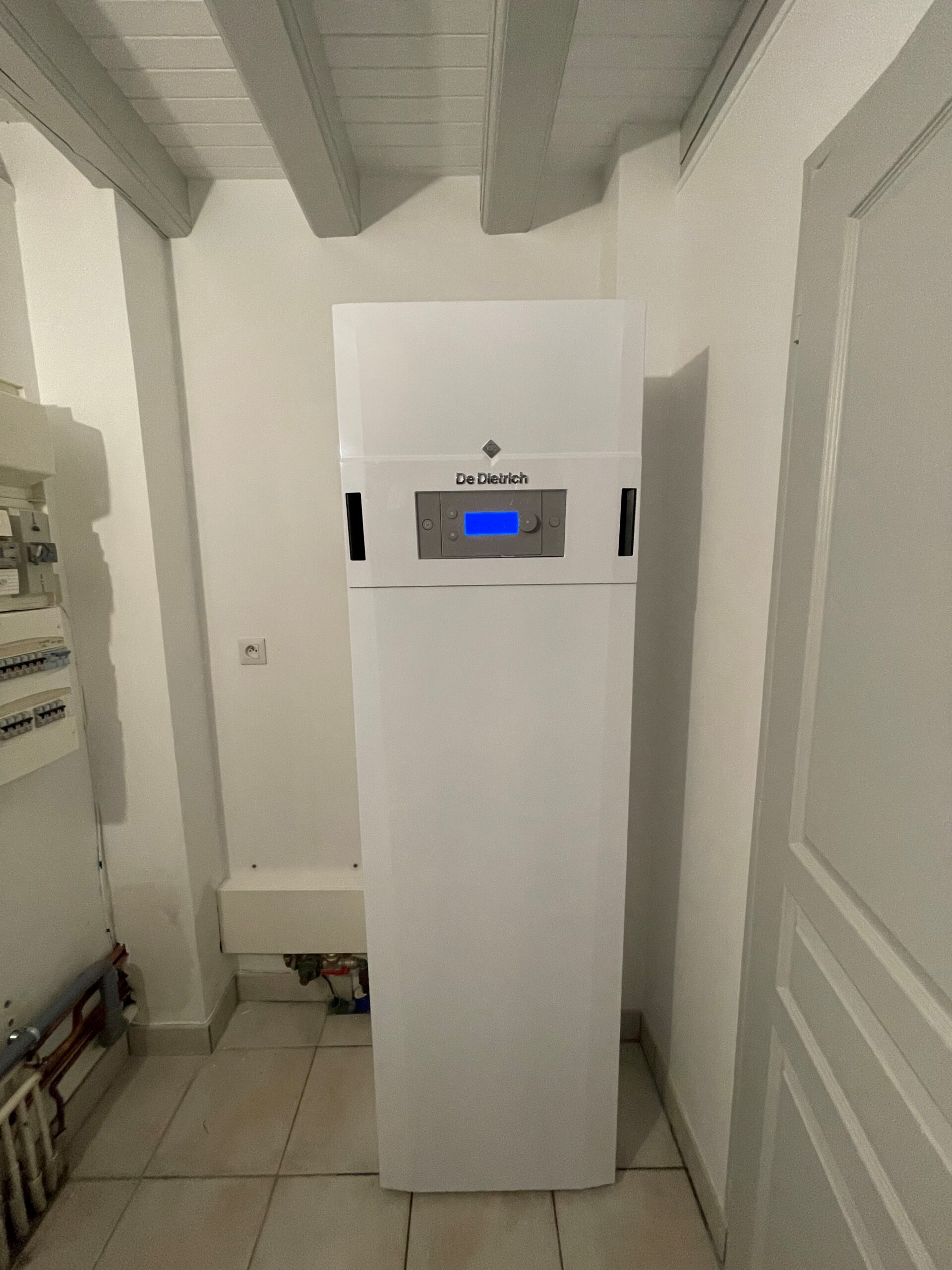 Cette pompe à chaleur hybride de marque De Dietrich a été installée remplacement d’une chaudière fioul en fin de vie.