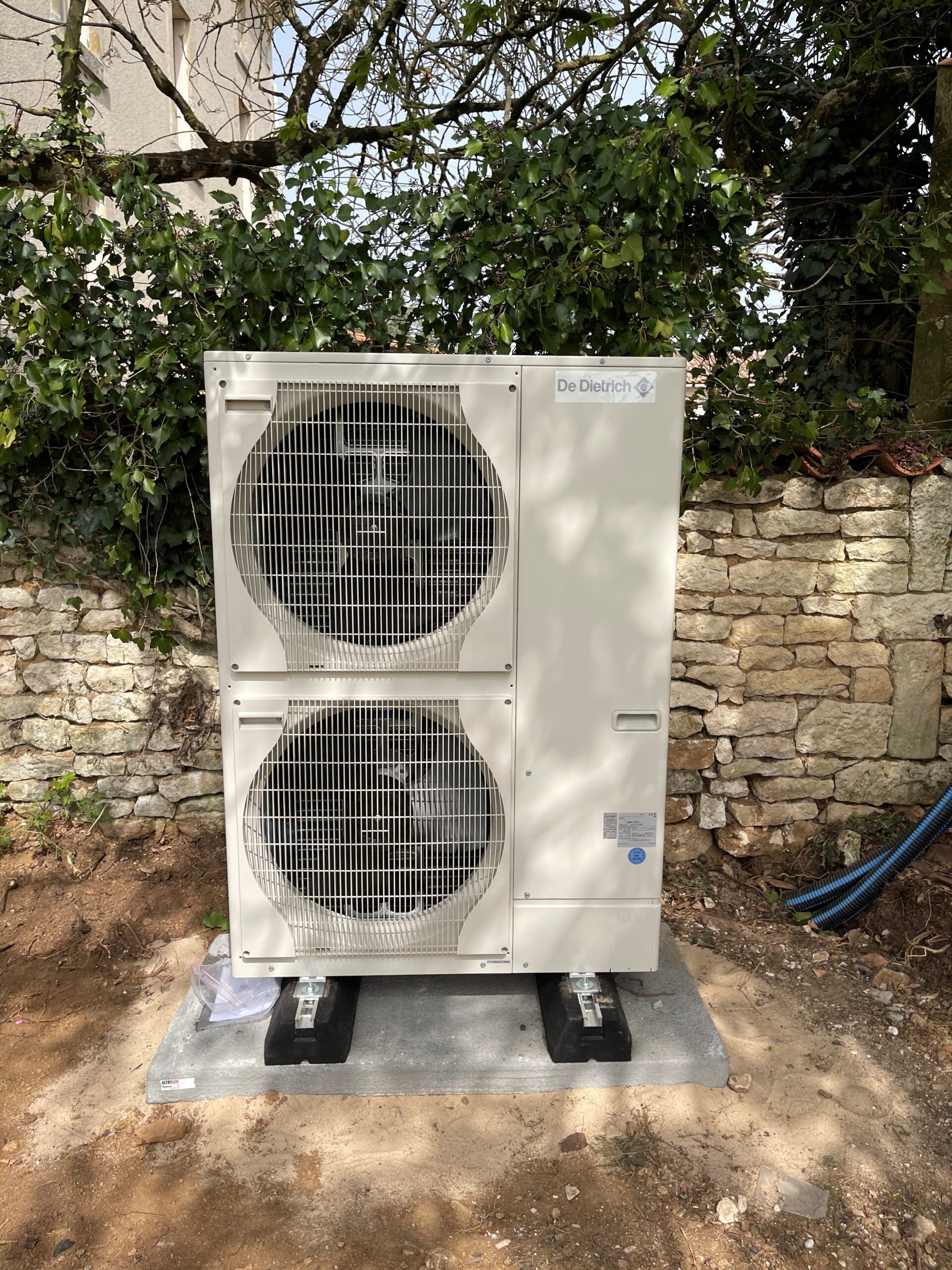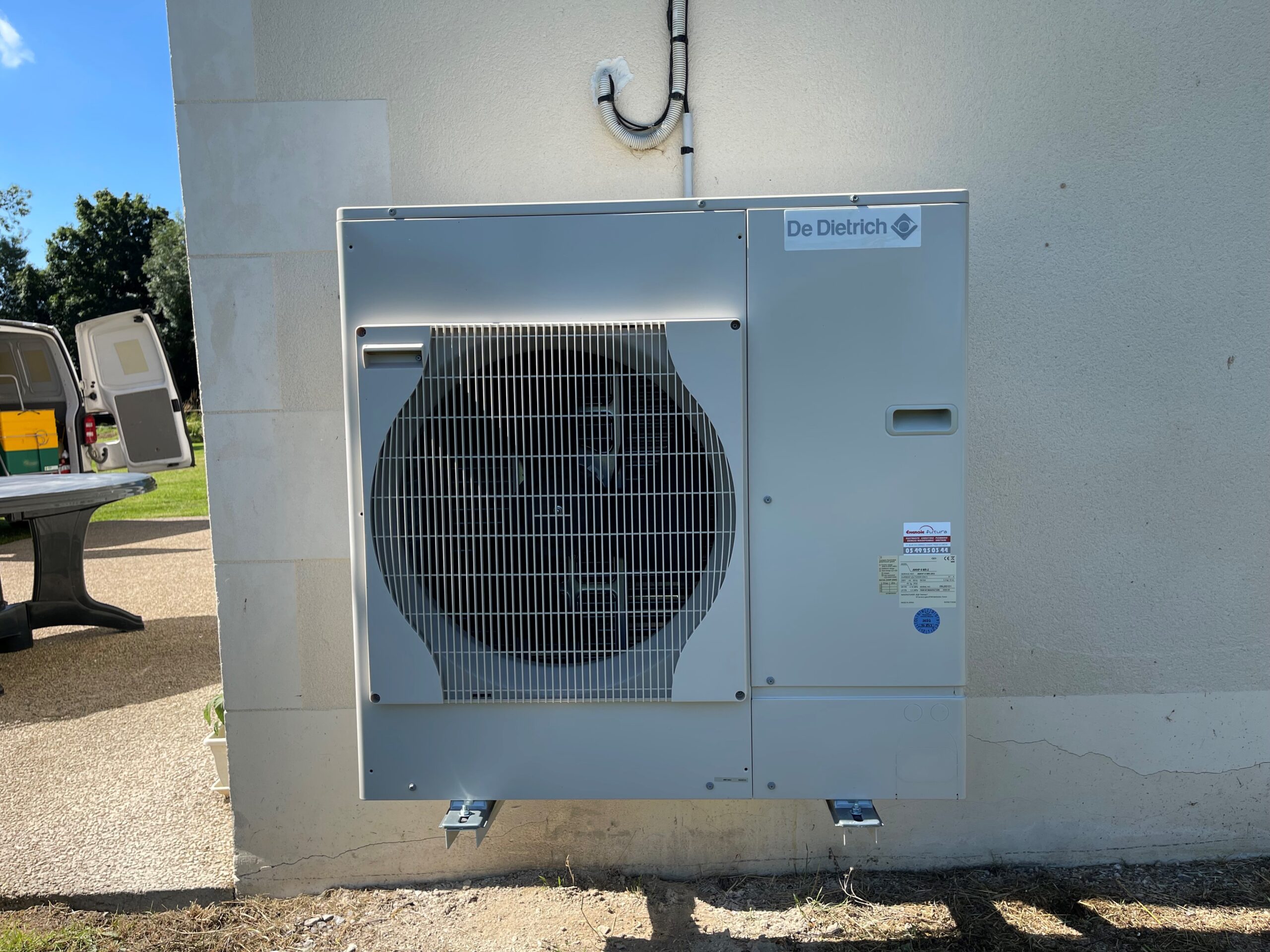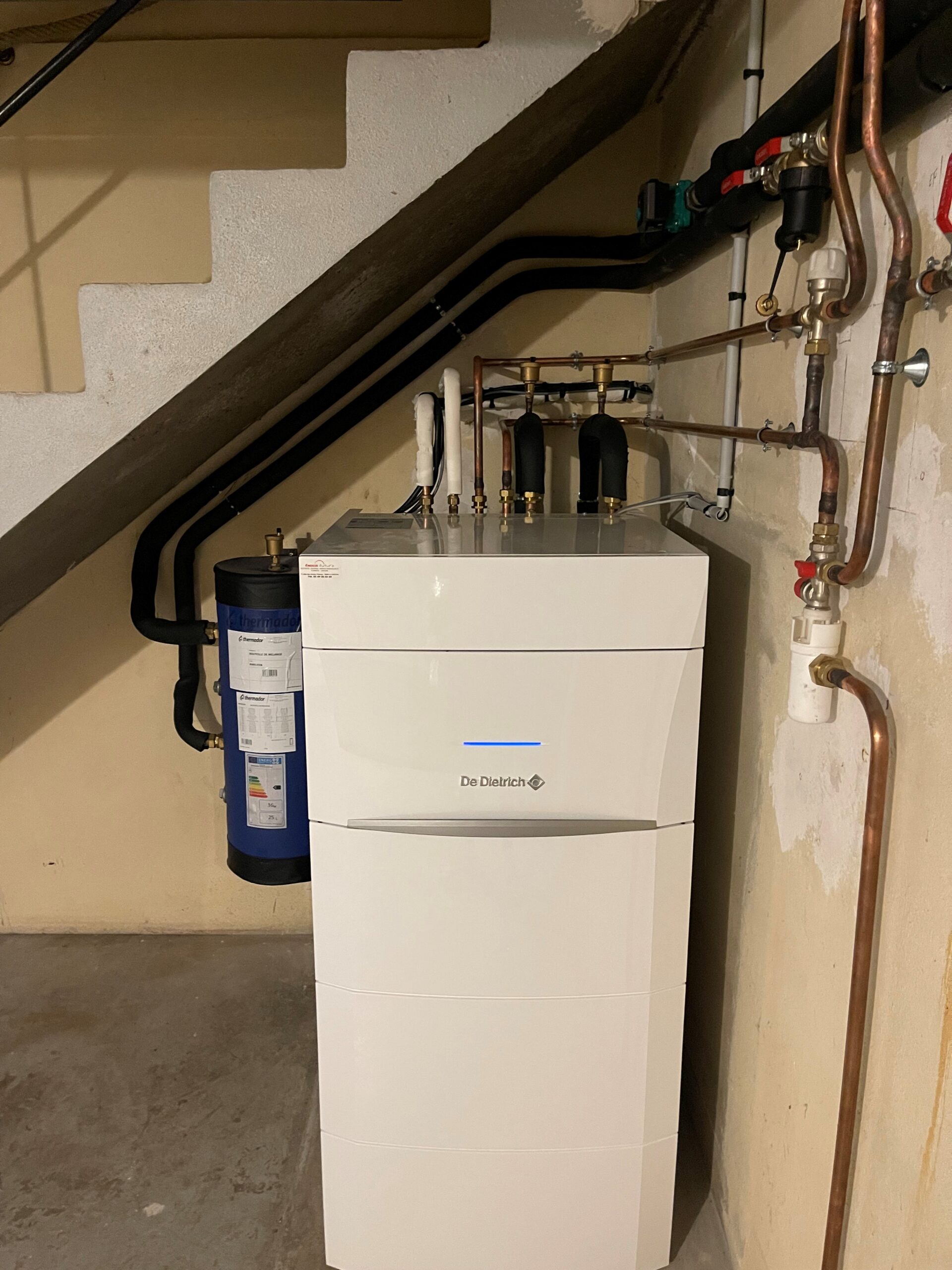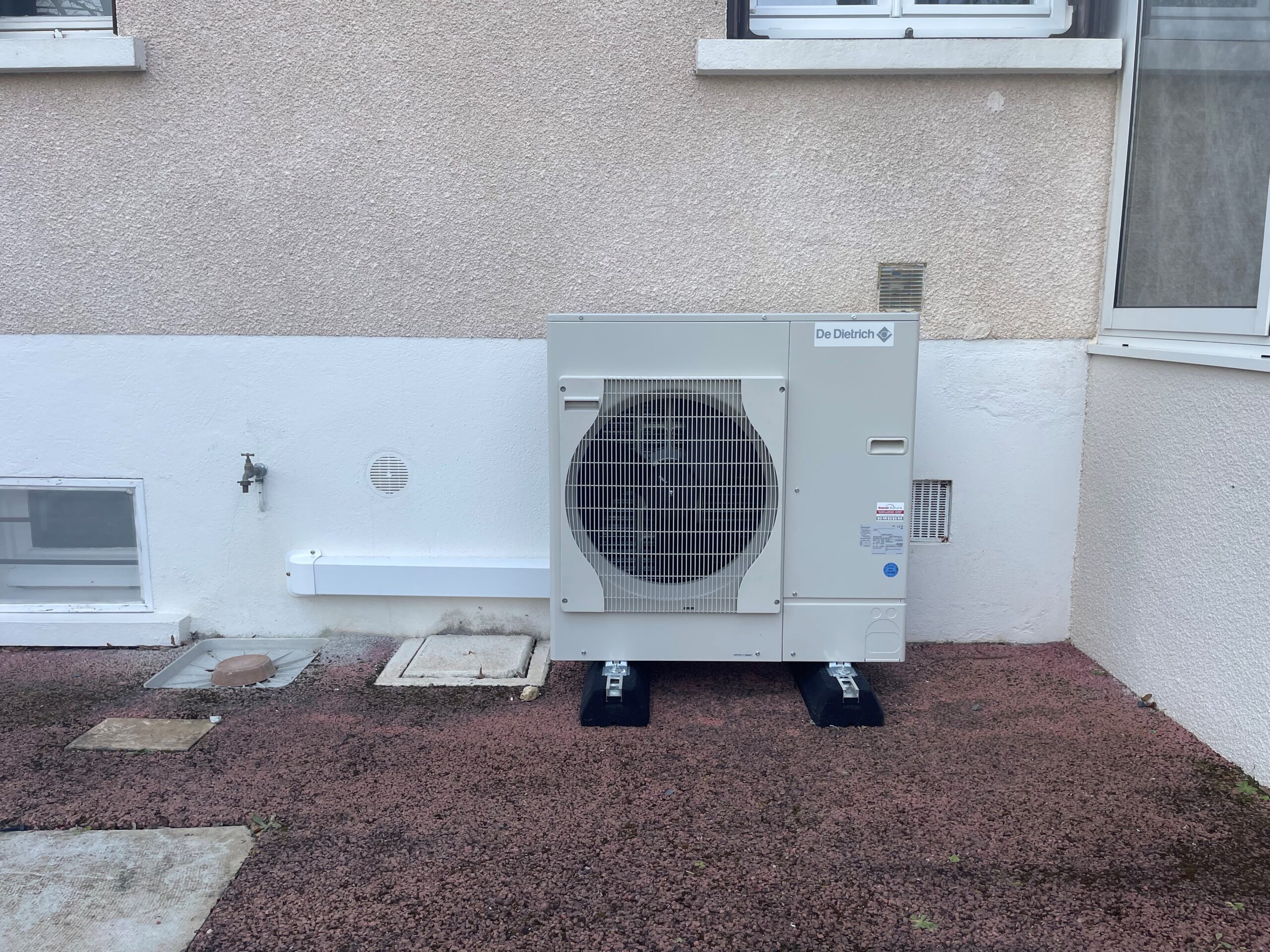 Cette pompe à chaleur hybride de marque De Dietrich a été installée remplacement d’une chaudière fioul en fin de vie.